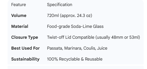 • Optimal Capacity: The 720ml size is the industry standard for family-sized pasta sauces and professional-grade passata.