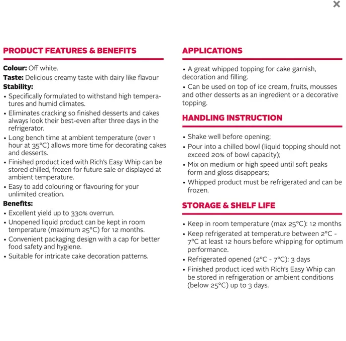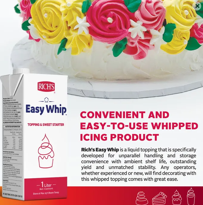 Rich's Easy Whip is a liquid topping that is specifically developed for unparallel handling and storage convenience with ambient shelf life.