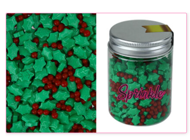 • Holly and Berry Sprinkles are a festive and decorative assortment of sprinkles featuring holly leaf and berry shapes, perfect for adding a touch of Christmas charm to your baked goods.