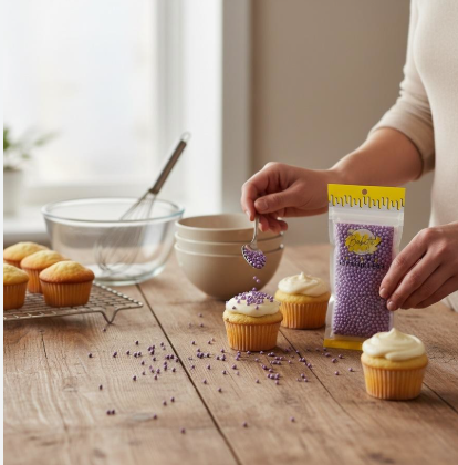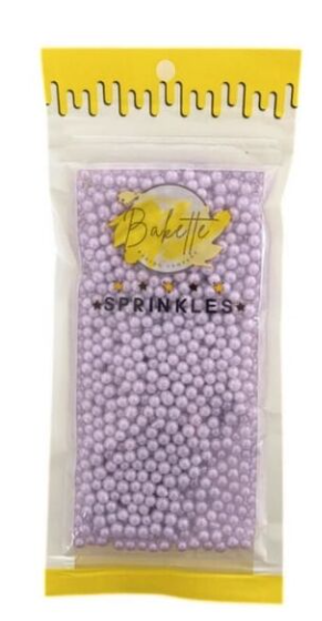 Bakette Pearly Purple Sugar Pearls are 4mm edible, pearlescent orange, ball-shaped sprinkles packaged in 56g resealable bags. These gluten-free, vegan-friendly, and Halal/Kosher certified pearls are designed to enhance cakes, cookies, and cupcakes.