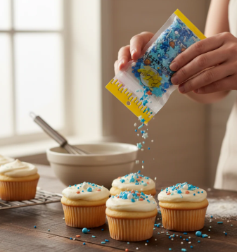 • Vibrant ocean-hued mix. Includes light blue starfish, aqua seahorses, blue, gold and white sugar pearls, white confetti blue and white jimmies.